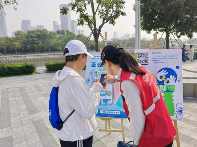 当天恰逢周末,暖医宝安·中医药养生游园会(冬藏篇)暨2025年膏方节活动也在此举行,人流量颇多,现场十分热闹。“微信扫一下,就可以码上畅游伶仃洋两岸!”蓝白相间的展架前,志愿者的讲解声让几位市民停下脚步,好奇地询问操作方法。只见市民微信扫码后,马上跳转进入到了“湾里趣玩”的小程序,界面简洁明快,标志性建筑是连接起珠江口东西两岸的深中通道。